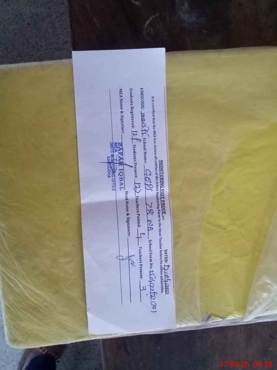| Attendance Register | Head Teacher | MEA with School | Visit Proof |