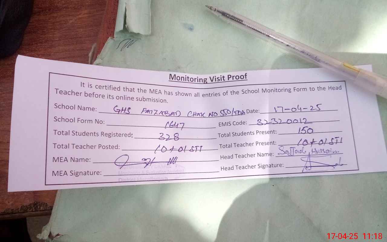 | EMIS Code: 32320012 | Name of School: GHS FAIZ ABAD CHAK NO.550/TDA | |||