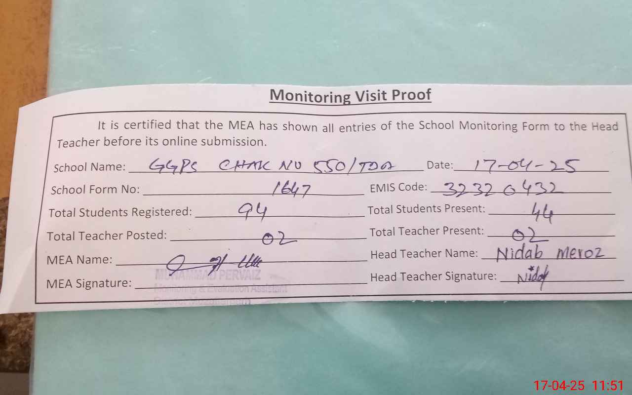 | EMIS Code: 32320432 | Name of School: GGPS CHAK NO. 550 TDA | |||
