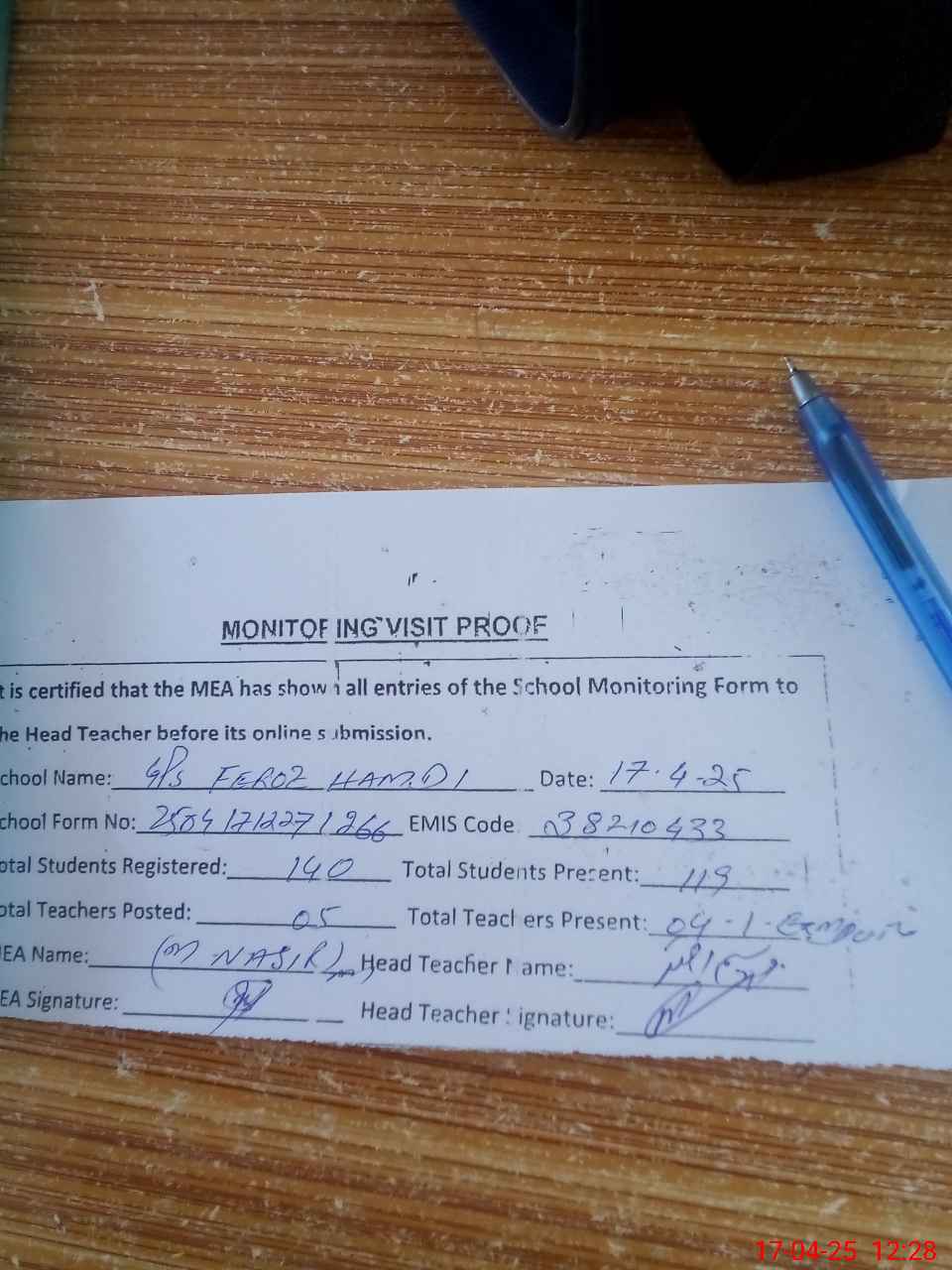 | EMIS Code: 38210433 | Name of School: GPS DERA FEROZ HAMDI | |||