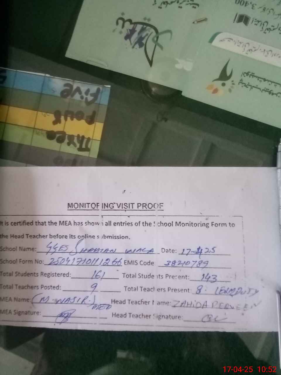 | Attendance Register | Head Teacher | MEA with School | Visit Proof |