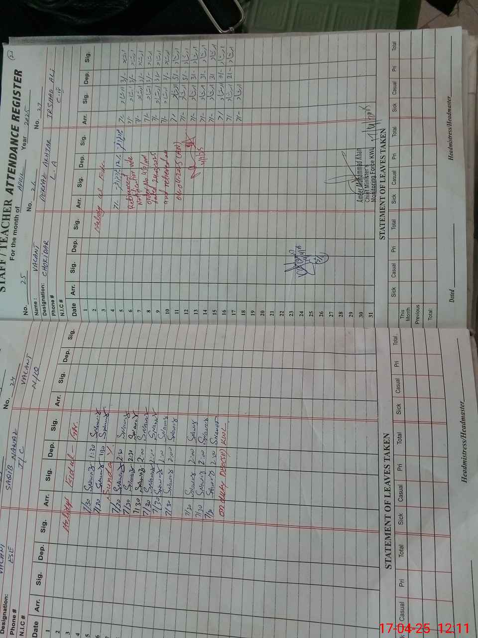 | 36**** | Kh**** Ab**** | 1 | 0 | 25 | 0 | 0 | 0 | 0 | 0 | 0 | 0 | Exam Duty | |