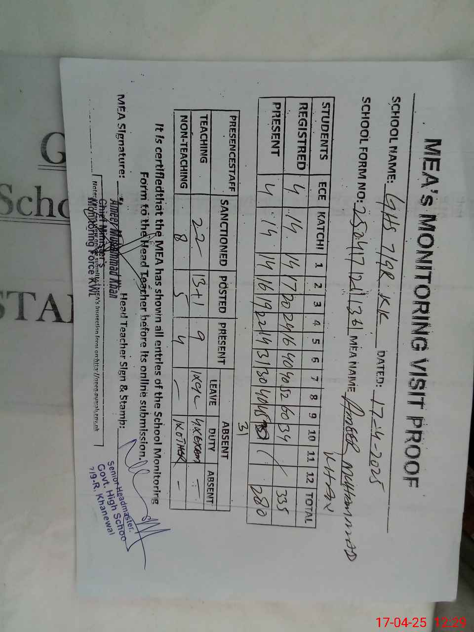 | Attendance Register | Head Teacher | MEA with School | Visit Proof |