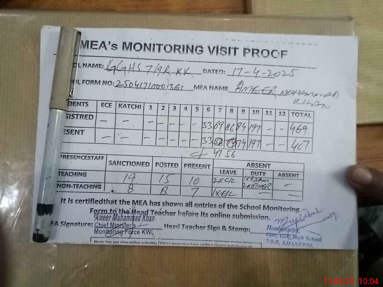 | Attendance Register | Head Teacher | MEA with School | Visit Proof |