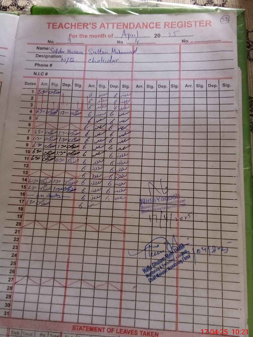 | CNIC | Full Name | Designation | R/C | Absence During Last Calender Month |