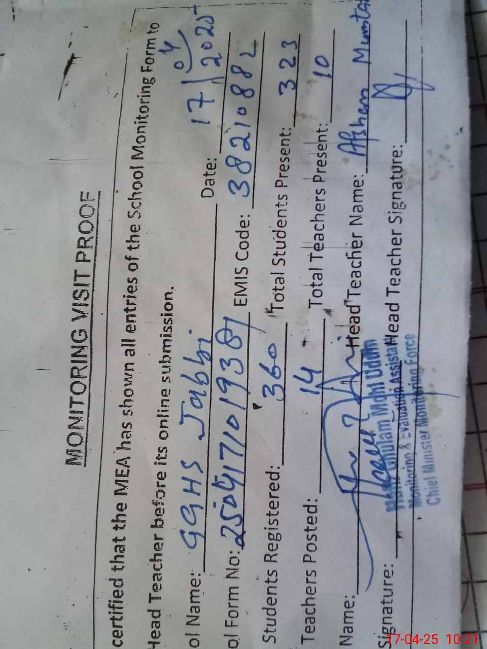 | Attendance Register | Head Teacher | MEA with School | Visit Proof |