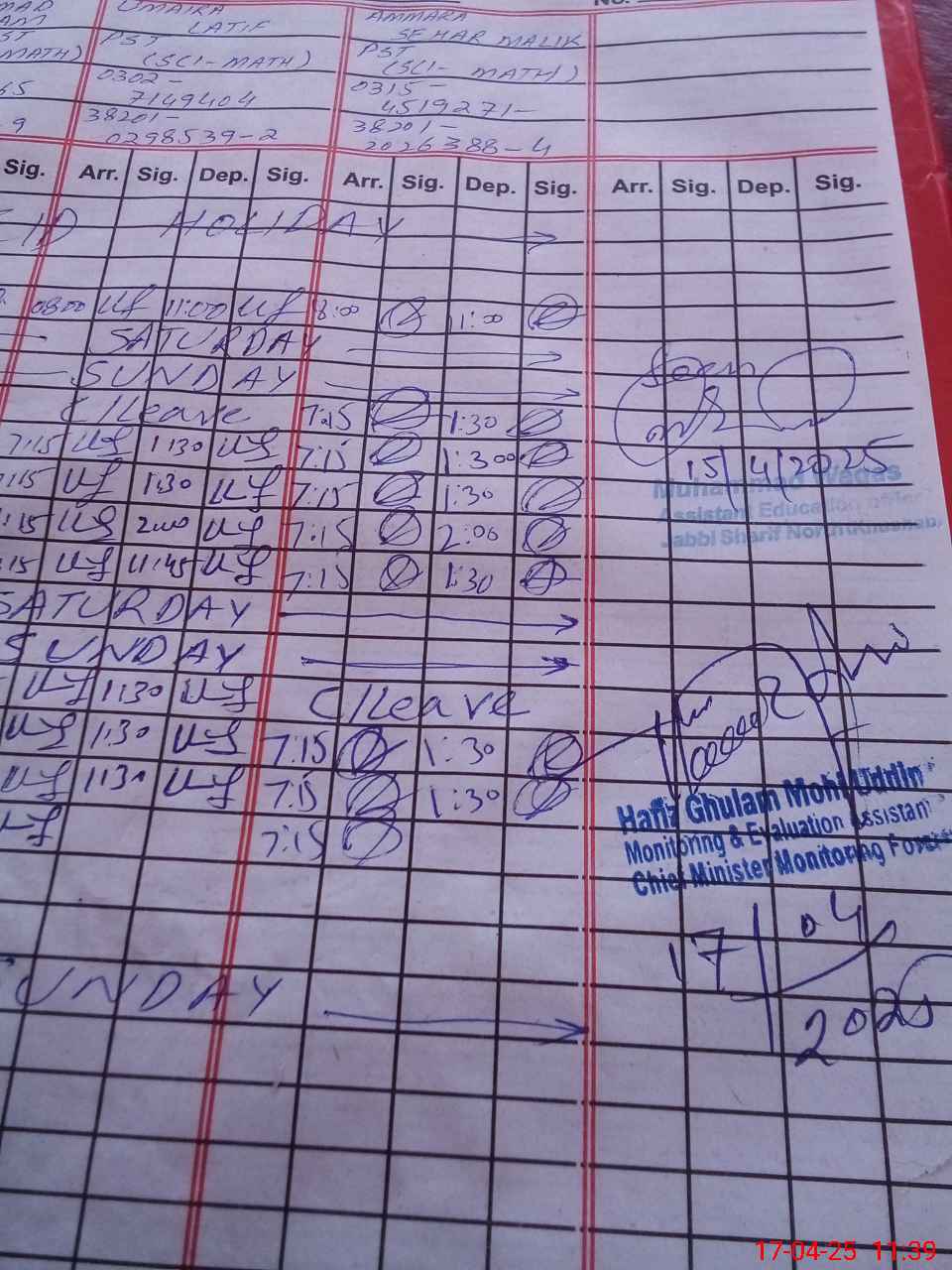 | CNIC | Full Name | Designation | R/C | Absence during last cal. month |