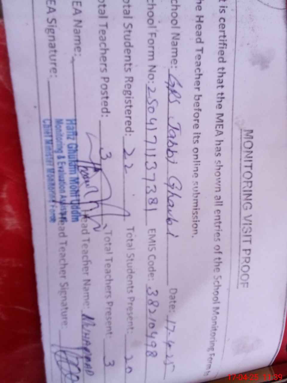 | Attendance Register | Head Teacher | MEA with School | Visit Proof |