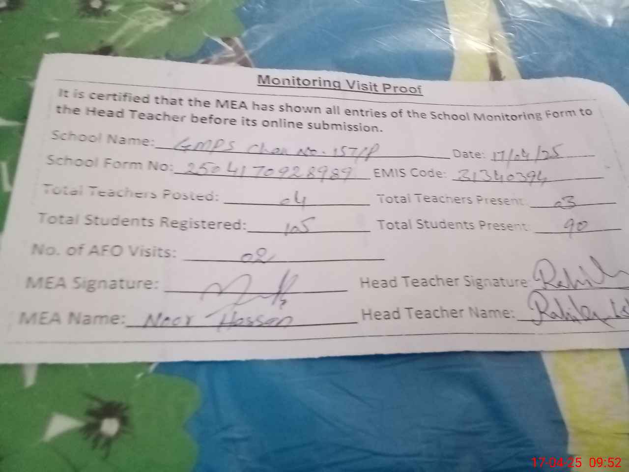 | Attendance Register | Head Teacher | MEA with School | Visit Proof |