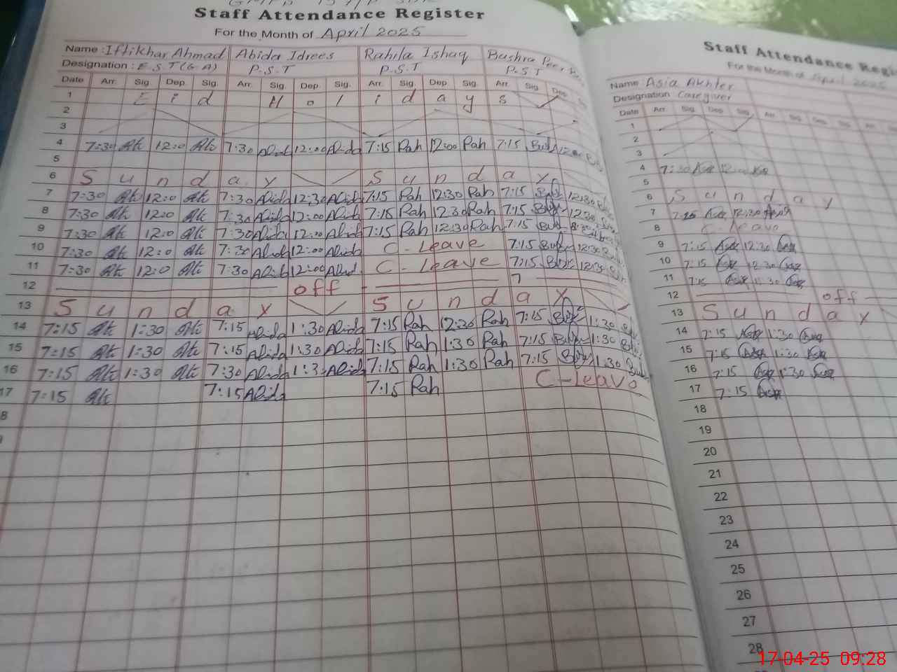 | CNIC | Full Name | Designation | R/C | Absence During Last Calender Month |