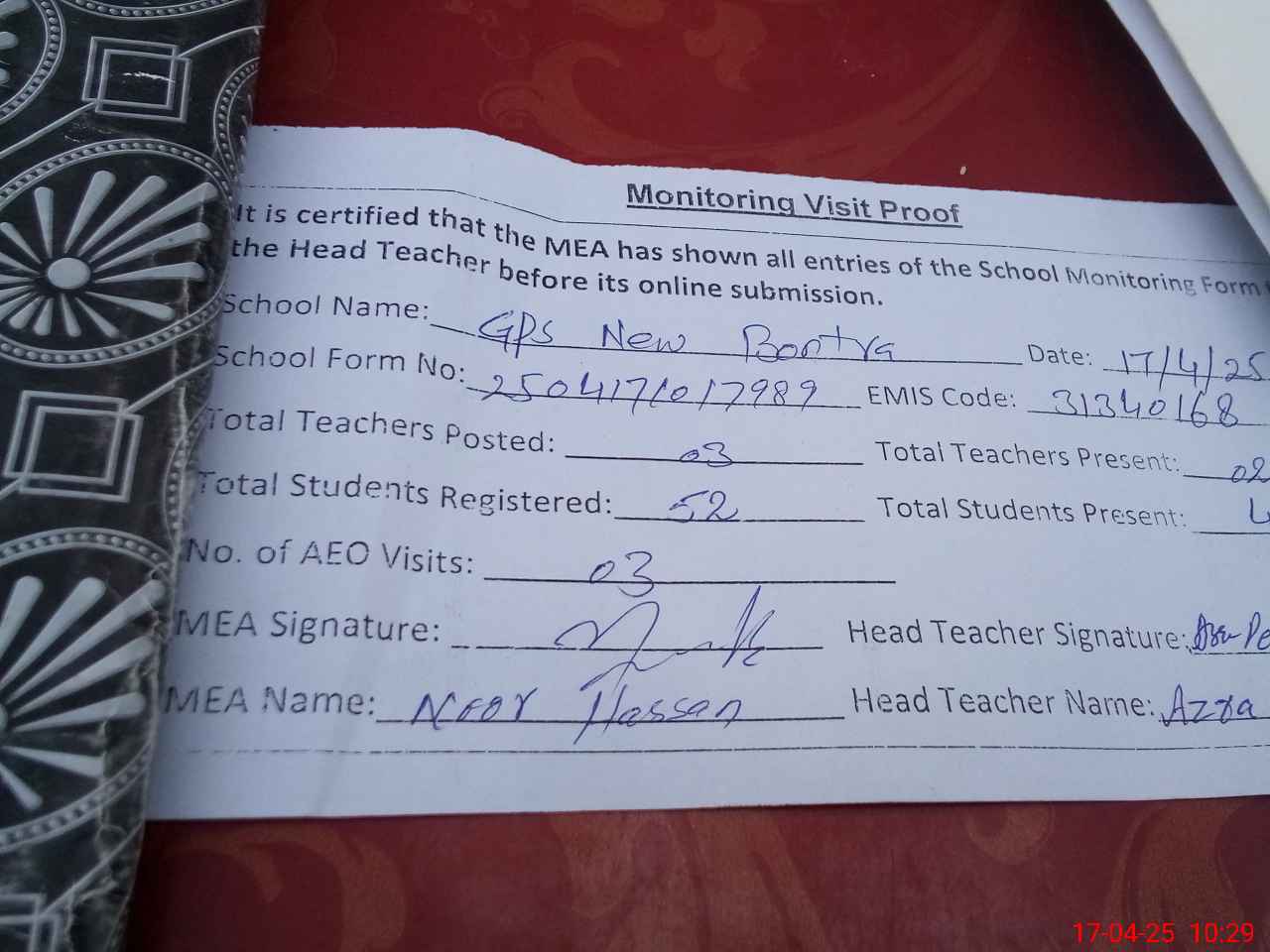 | Attendance Register | Head Teacher | MEA with School | Visit Proof |