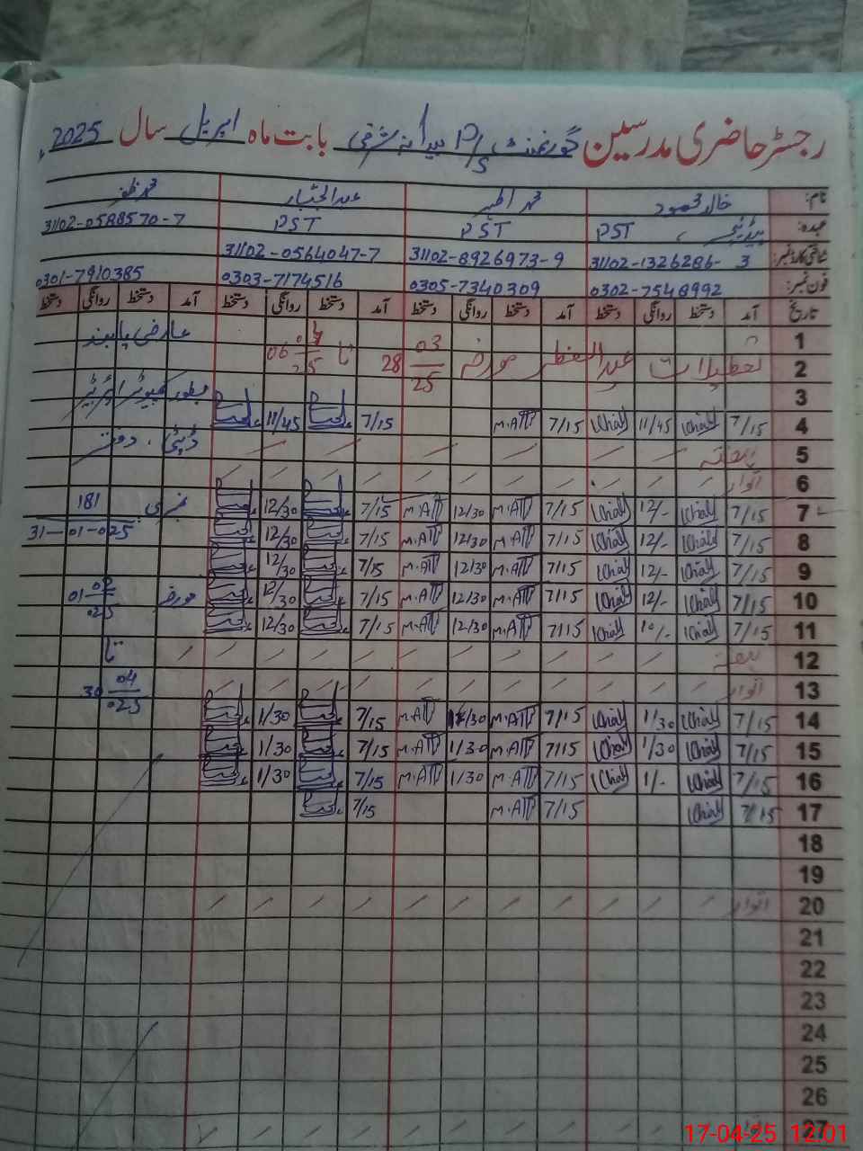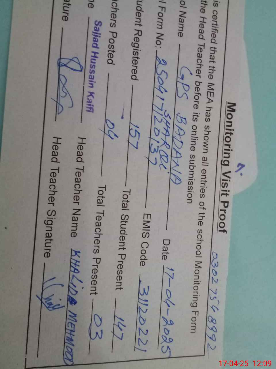 | Name: Kh**** Me**** Designation: (School Headmaster's/Headmistress's) PST Phone/Cell Number: 03**** |