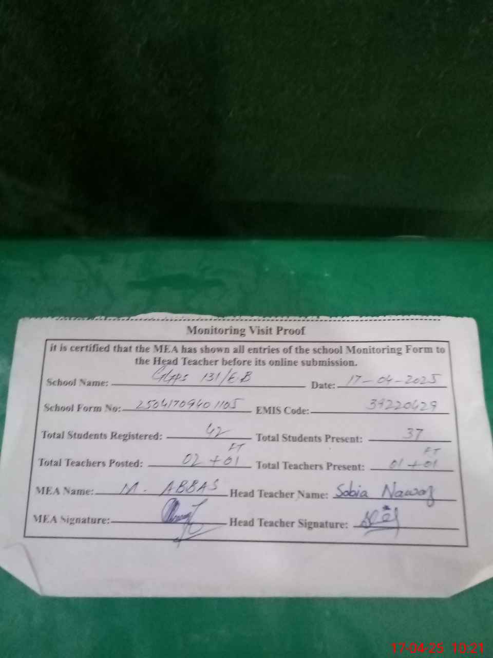 | Monitoring Date: 17-04-2025 | Start Time: 17-04-2025 09:40 AM | End Time: 17-04-2025 10:22 AM | Name of MEA: Mu**** Ab**** | |