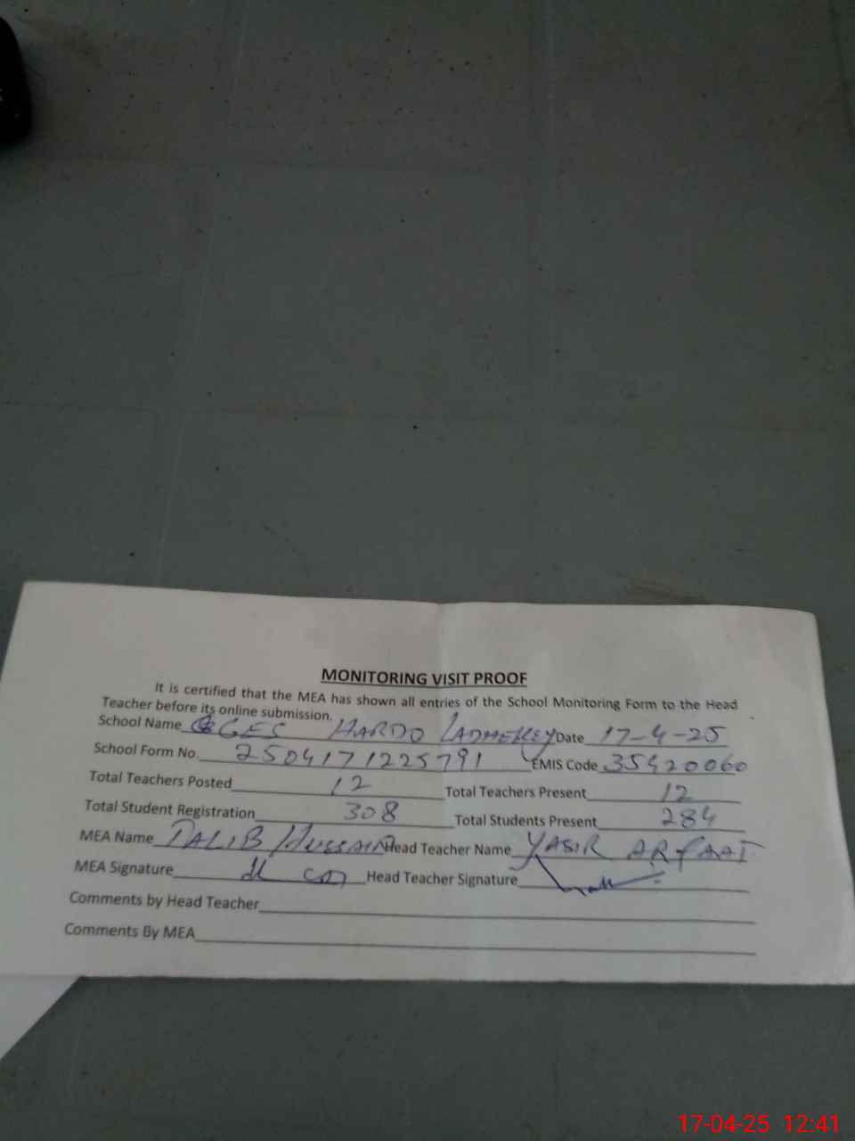 | Attendance Register | Head Teacher | MEA with School | Visit Proof |