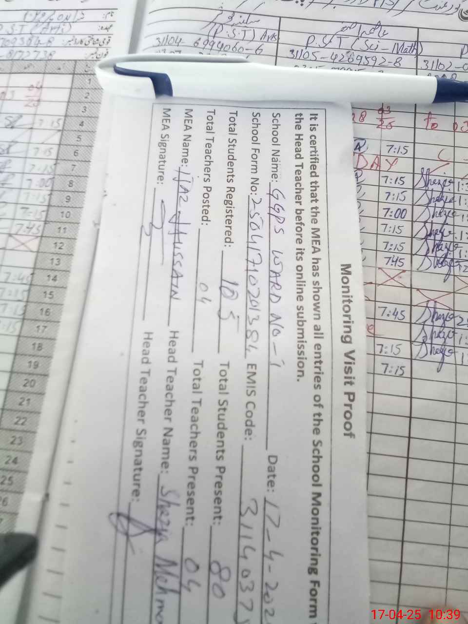 | Attendance Register | Head Teacher | MEA with School | Visit Proof |