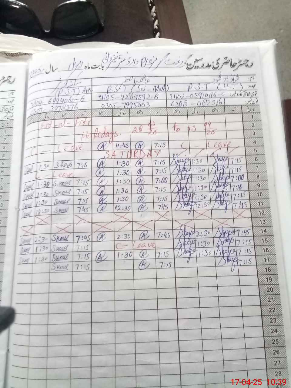 | Leave | Duty | Absent | Maternity | Medical | Ex- Pak |