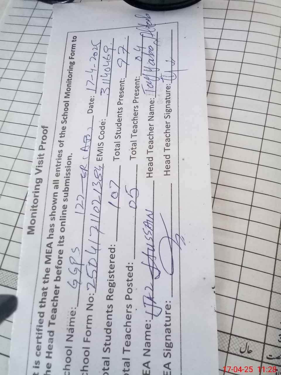 | Attendance Register | Head Teacher | MEA with School | Visit Proof |