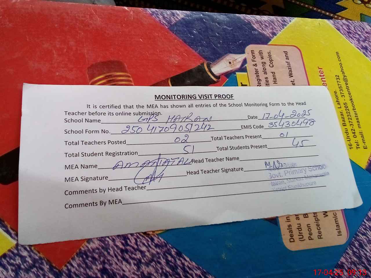| Attendance Register | Head Teacher | MEA with School | Visit Proof |
