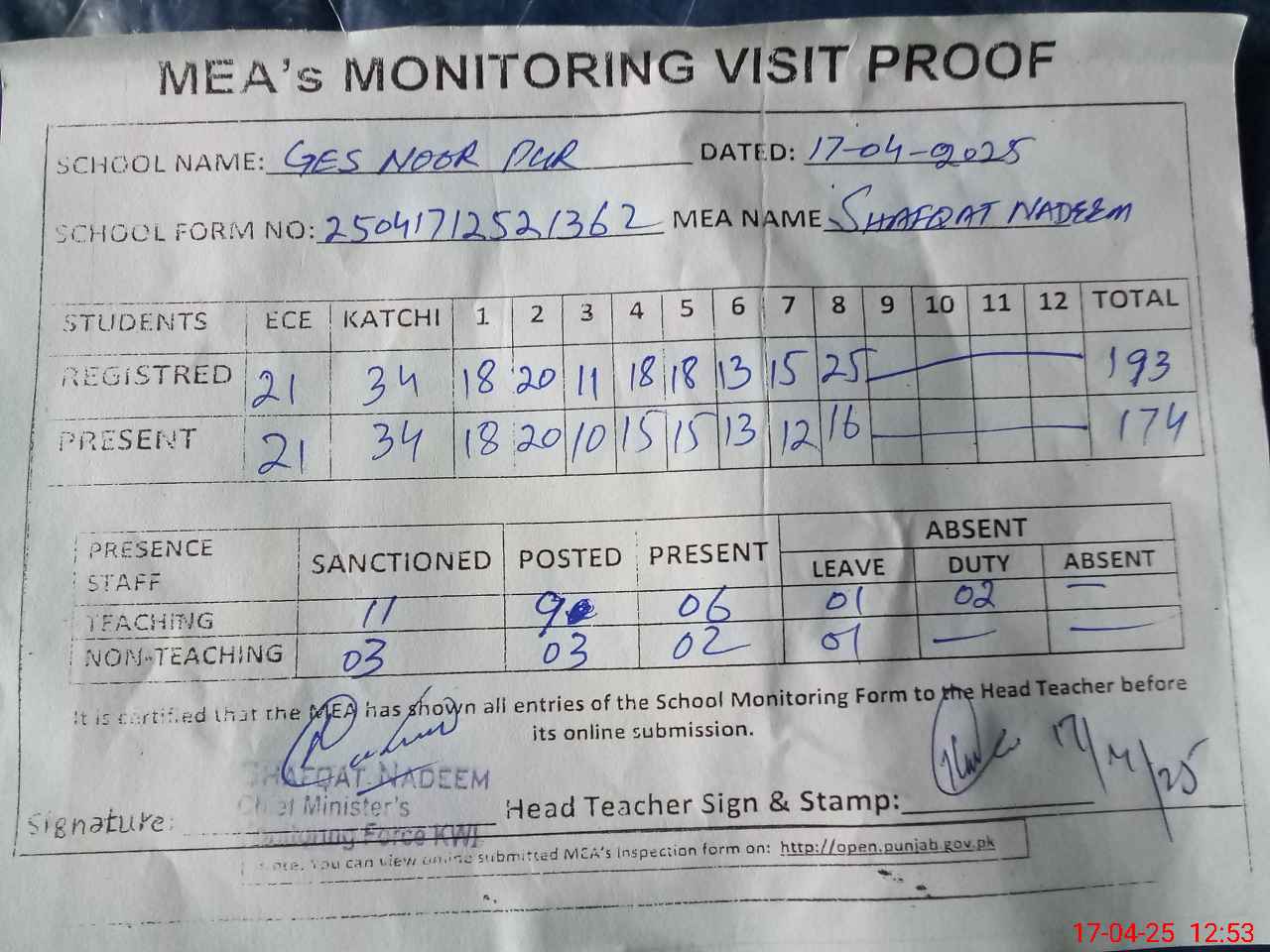 | EMIS Code: 36410209 | Name of School: GES NOOR PUR, KABIRWALA | |||