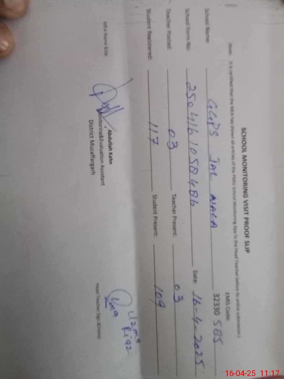 | Attendance Register | Head Teacher | MEA with School | Visit Proof |