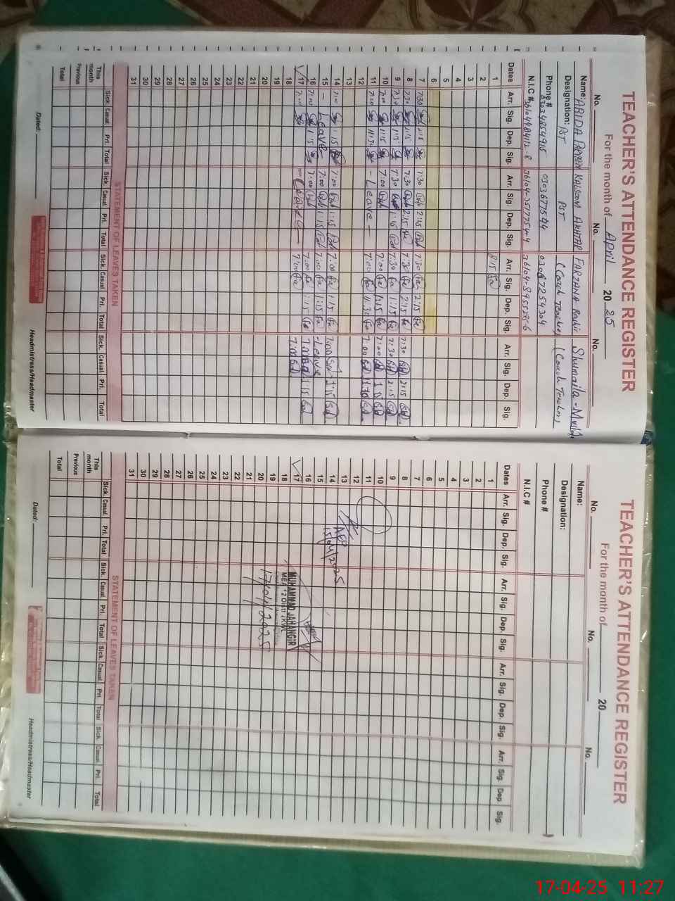 | CNIC | Full Name | Designation | R/C | Absence During Last Calender Month |