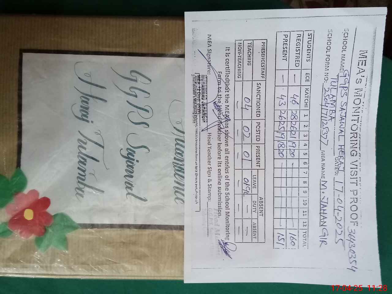 | Attendance Register | Head Teacher | MEA with School | Visit Proof |