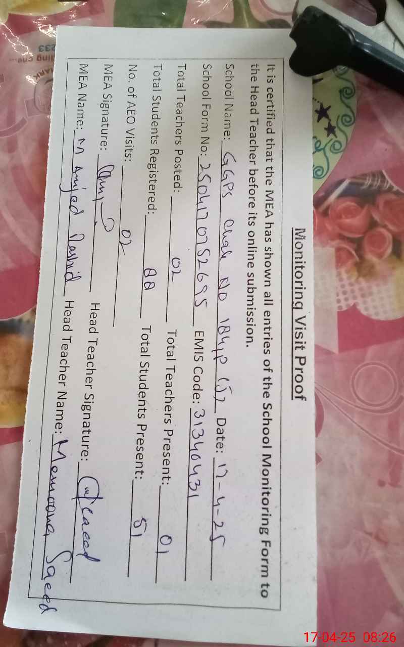 | Attendance Register | Head Teacher | MEA with School | Visit Proof |