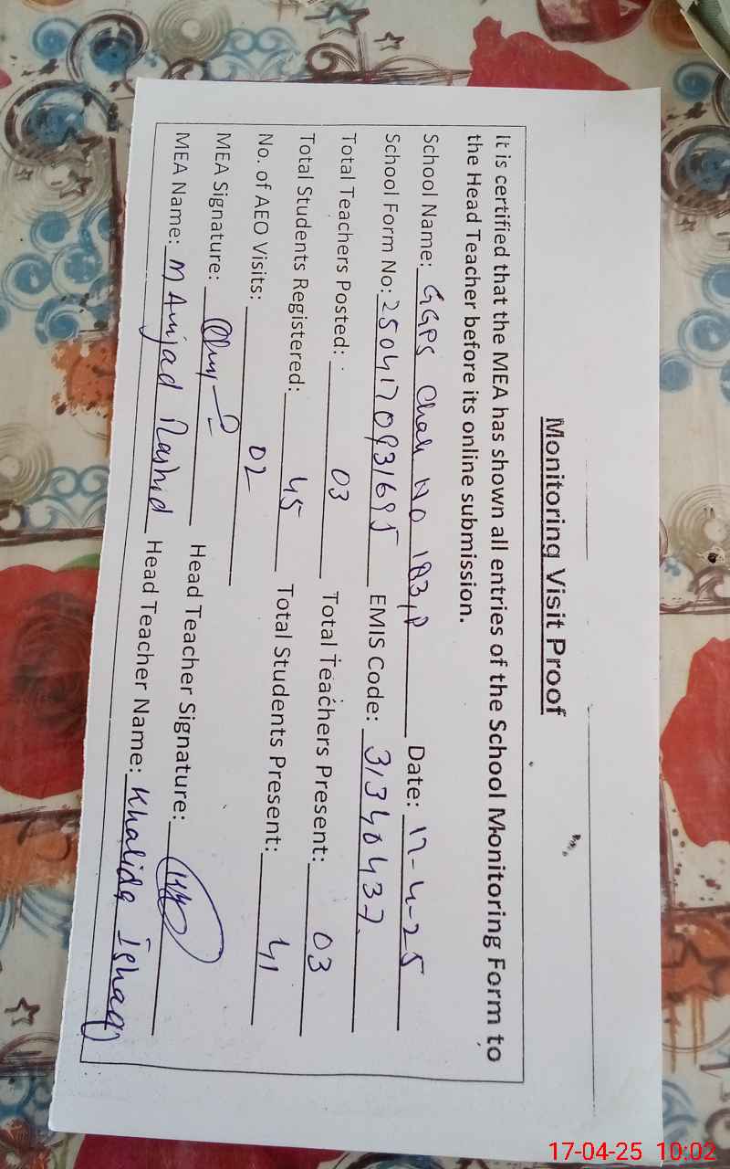 | Attendance Register | Head Teacher | MEA with School | Visit Proof |