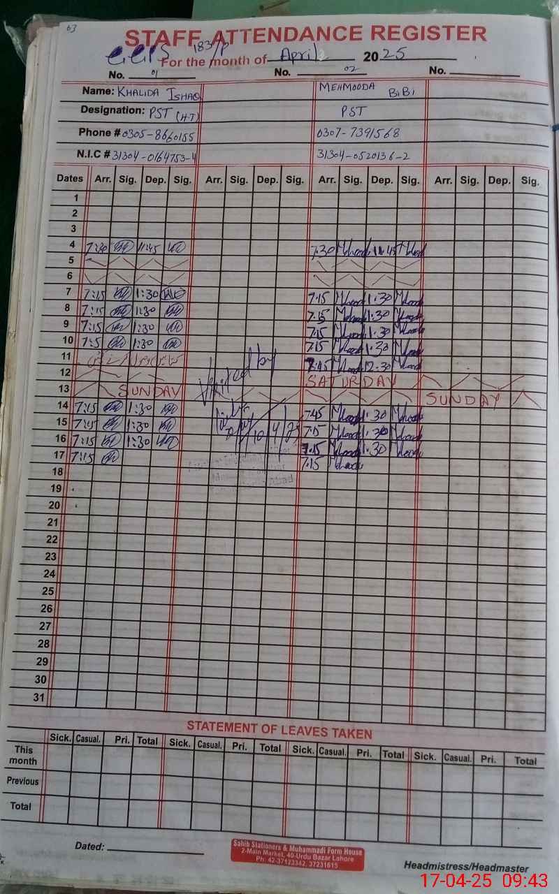 | Name: Kh**** Is**** Designation: (School Headmaster's/Headmistress's) PST Phone/Cell Number: 03**** |