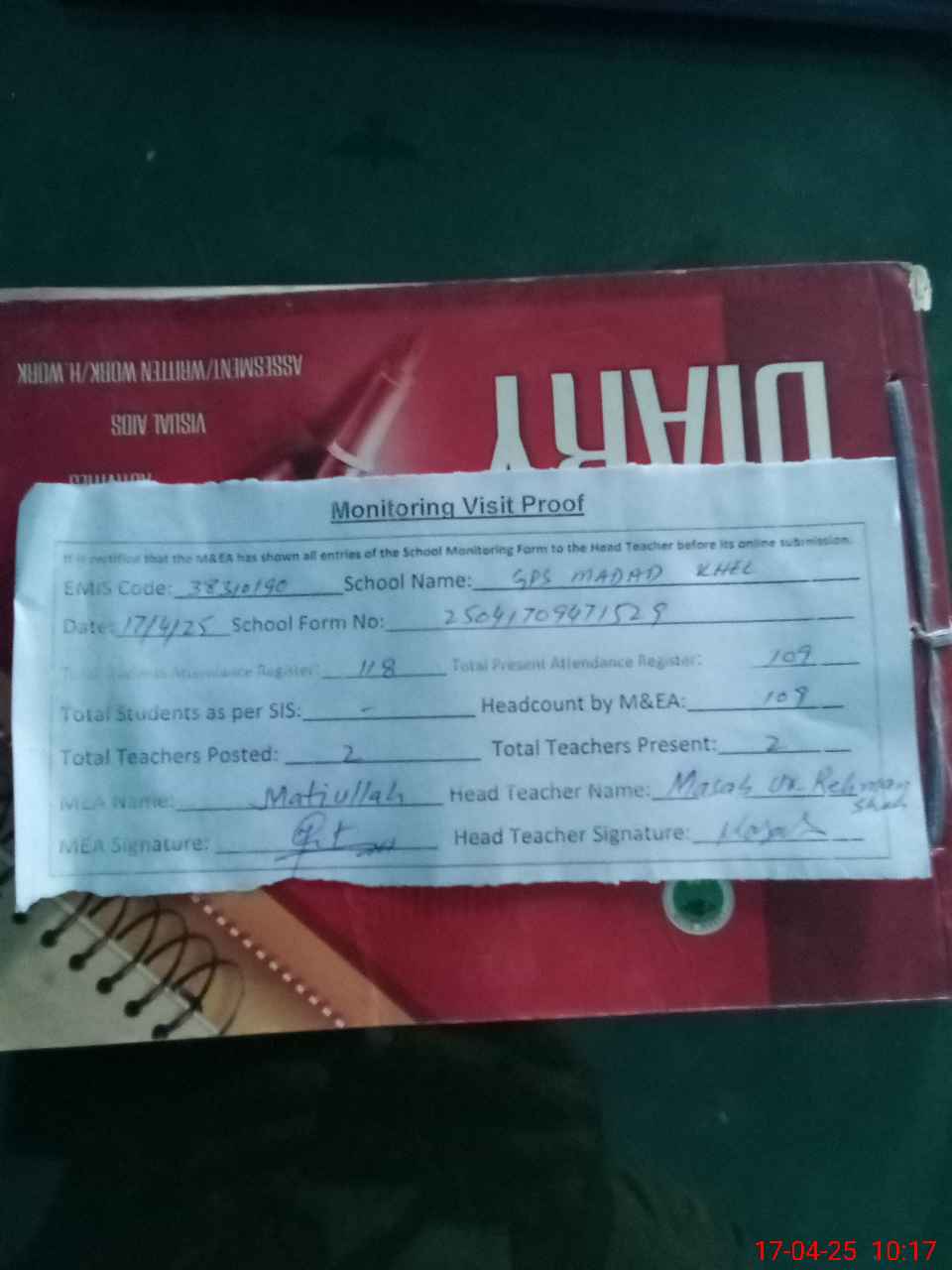| Attendance Register | Head Teacher | MEA with School | Visit Proof |