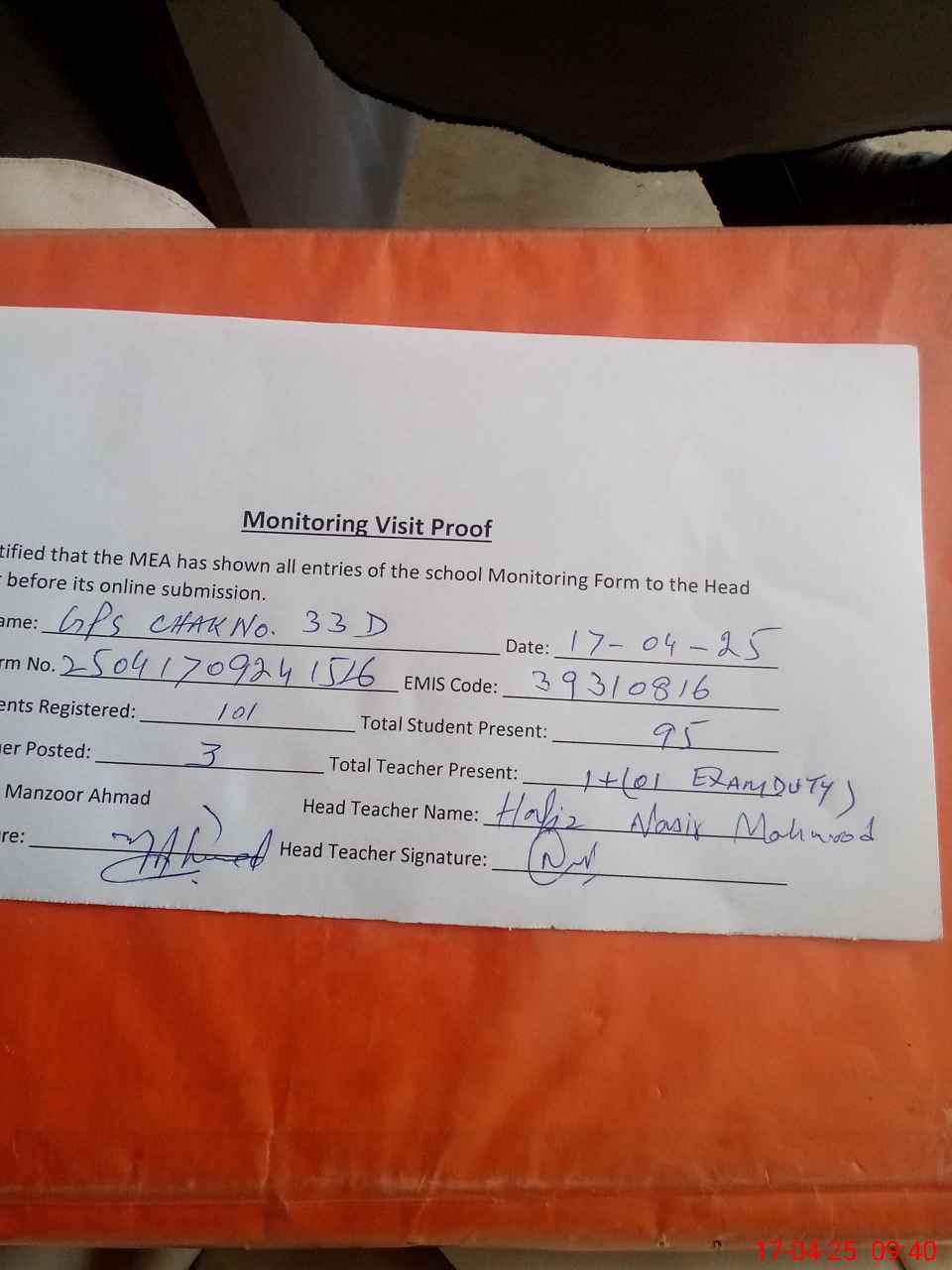 | EMIS Code: 39310816 | Name of School: GPS CHAK NO. 33-D | |||