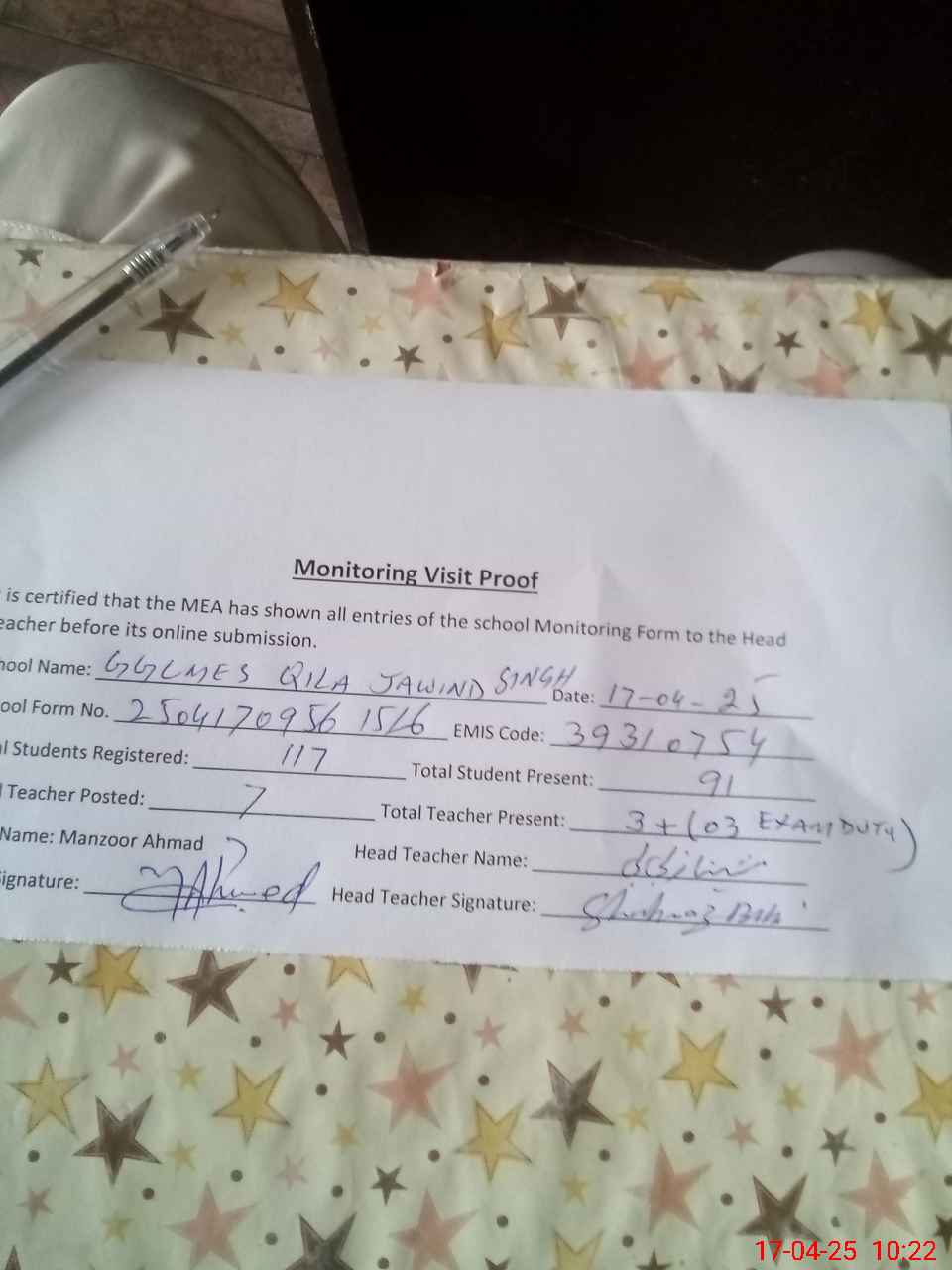 | EMIS Code: 39310754 | Name of School: GGCMES QILA JAWIND SINGH | |||
