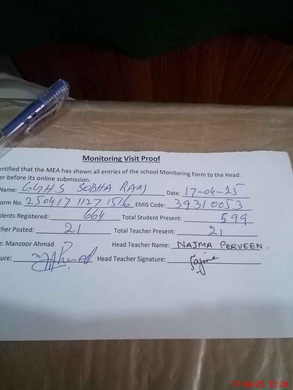 | Attendance Register | Head Teacher | MEA with School | Visit Proof |