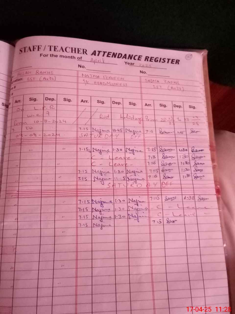 | CNIC | Full Name | Designation | R/C | Absence During Last Calender Month |