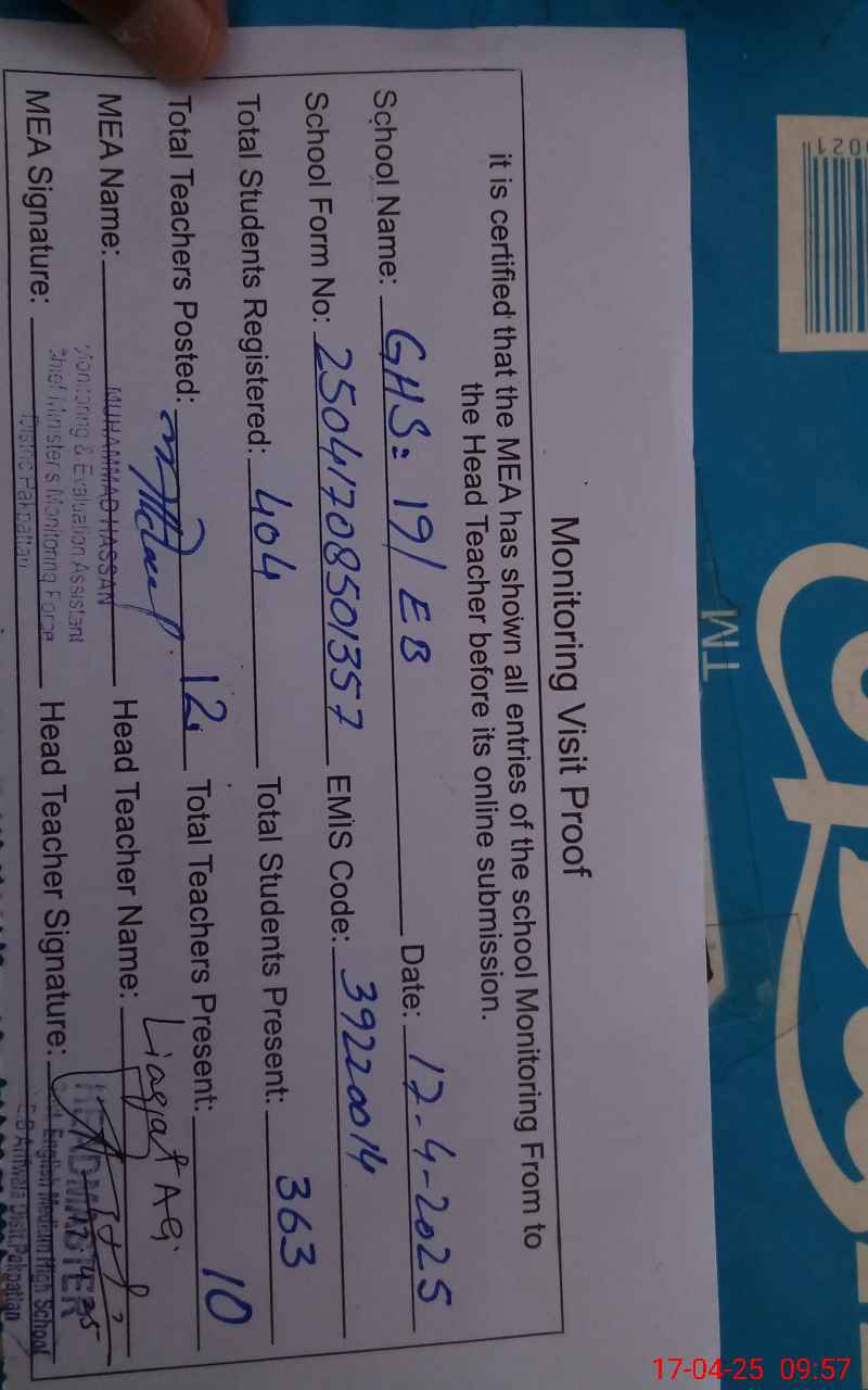 | EMIS Code: 39220014 | Name of School: GHS 19 EB ARIFWALA | |||