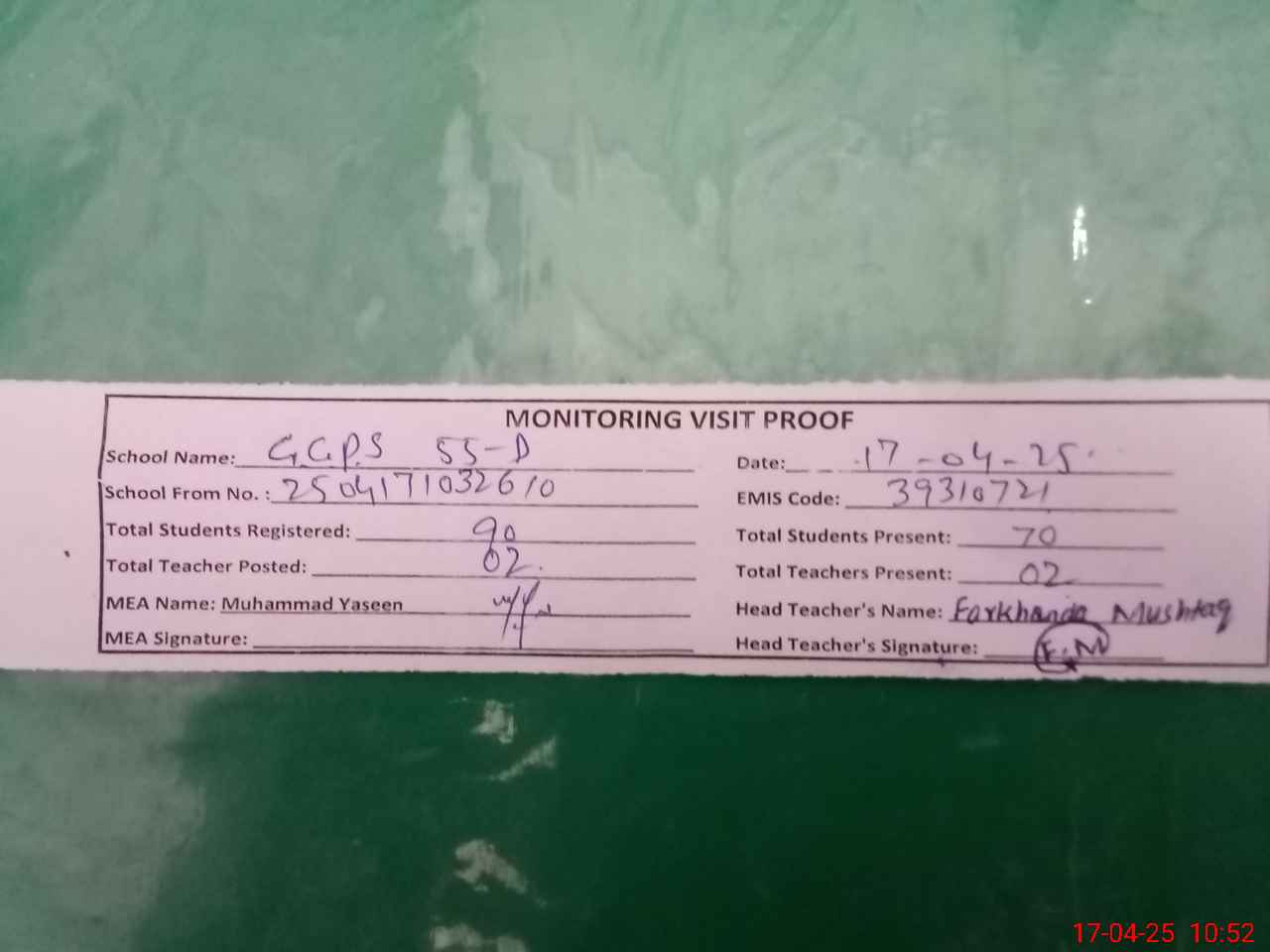| Attendance Register | Head Teacher | MEA with School | Visit Proof |