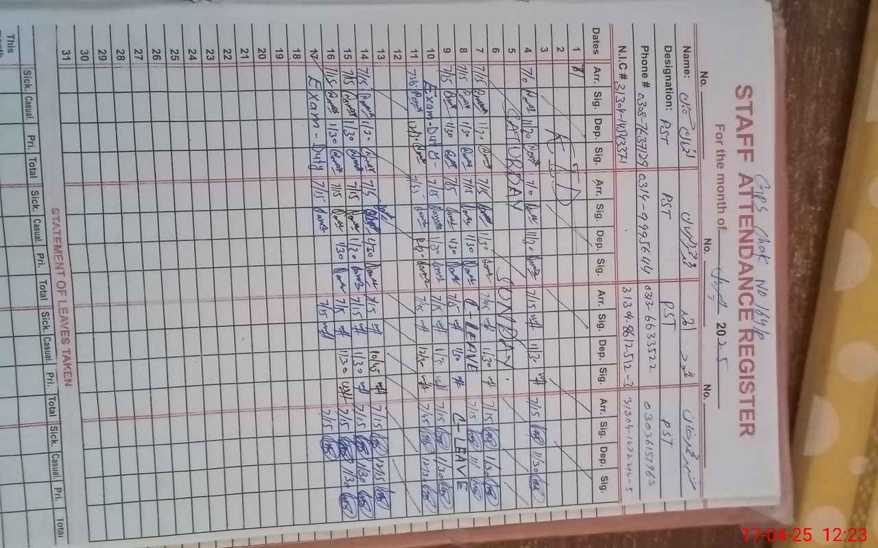 | CNIC | Full Name | Designation | R/C | Absence During Last Calender Month |
