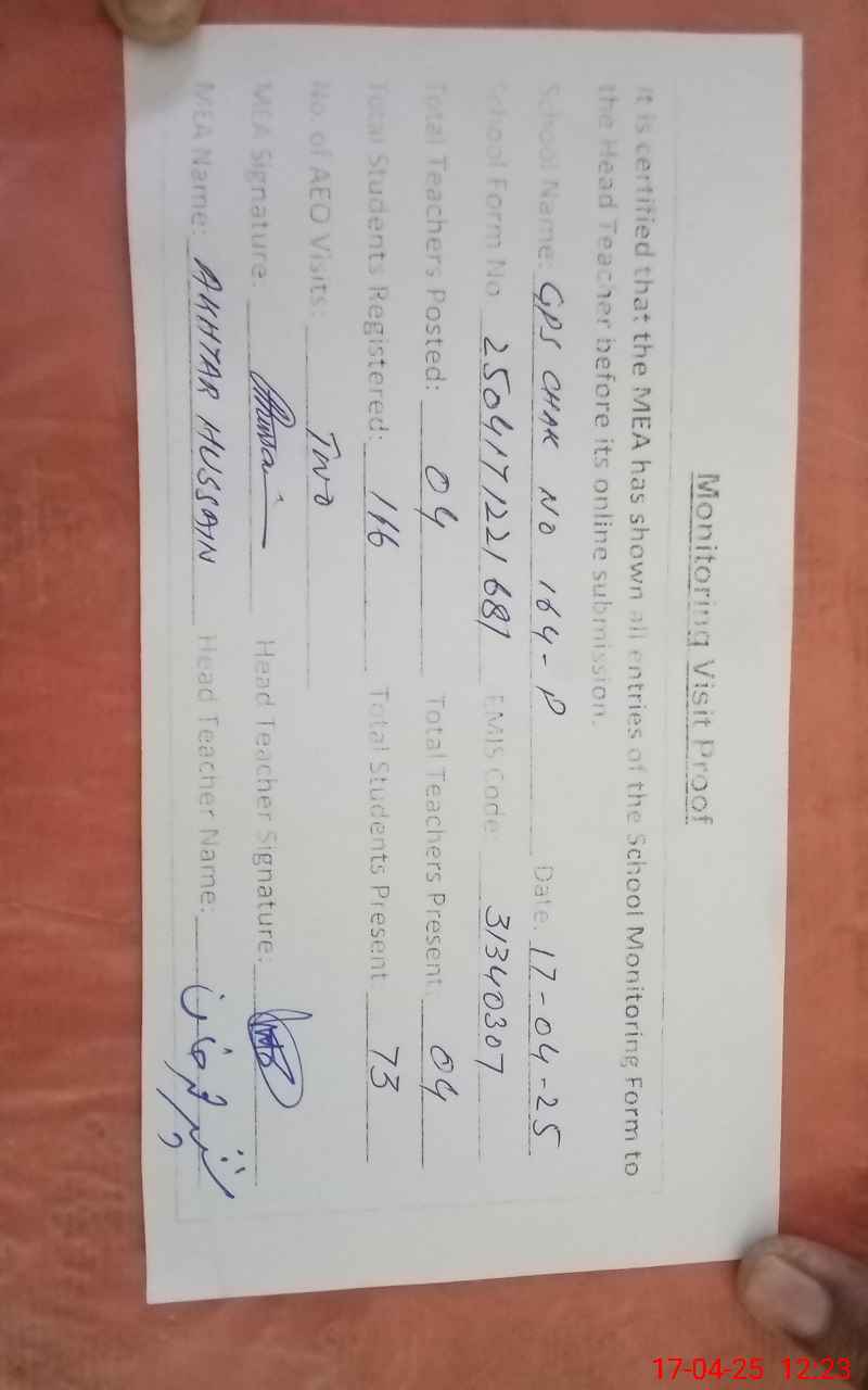 | Attendance Register | Head Teacher | MEA with School | Visit Proof |
