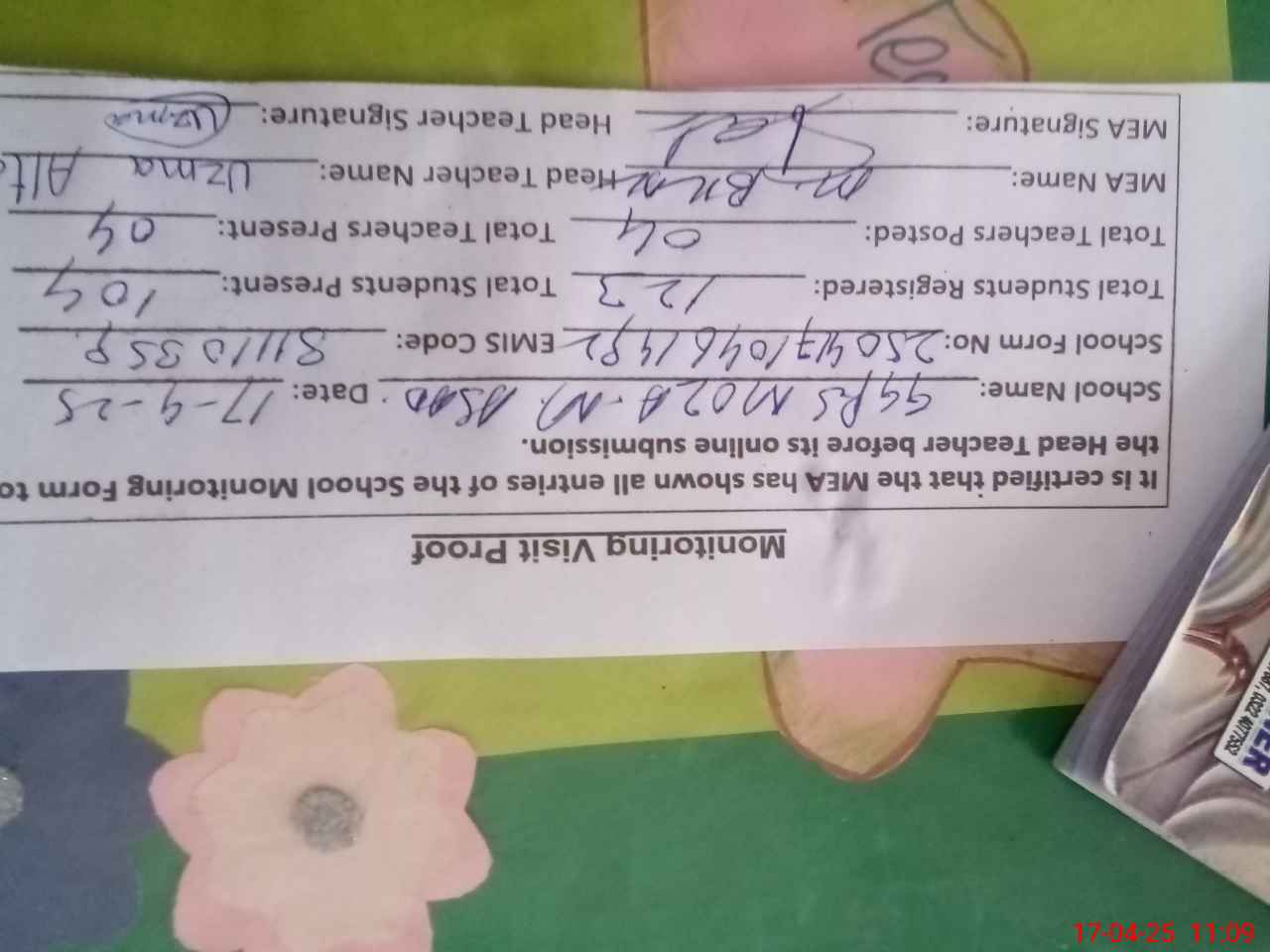 | Attendance Register | Head Teacher | MEA with School | Visit Proof |