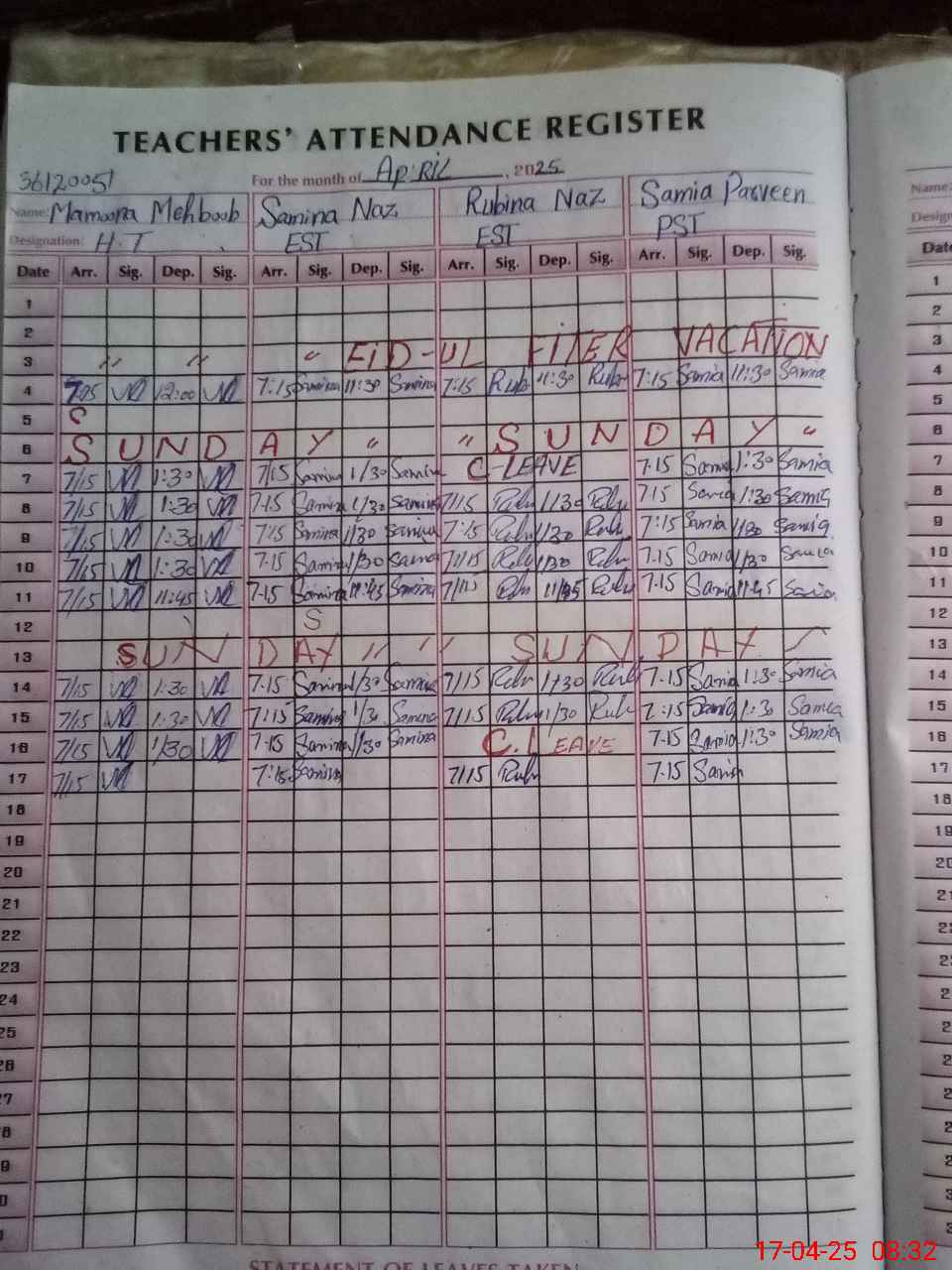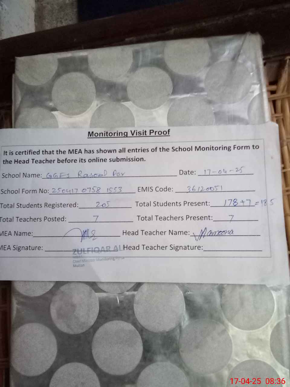 | Monitoring Date: 17-04-2025 | Start Time: 17-04-2025 07:58 AM | End Time: 17-04-2025 08:37 AM | Name of MEA: Zu**** Al**** | |