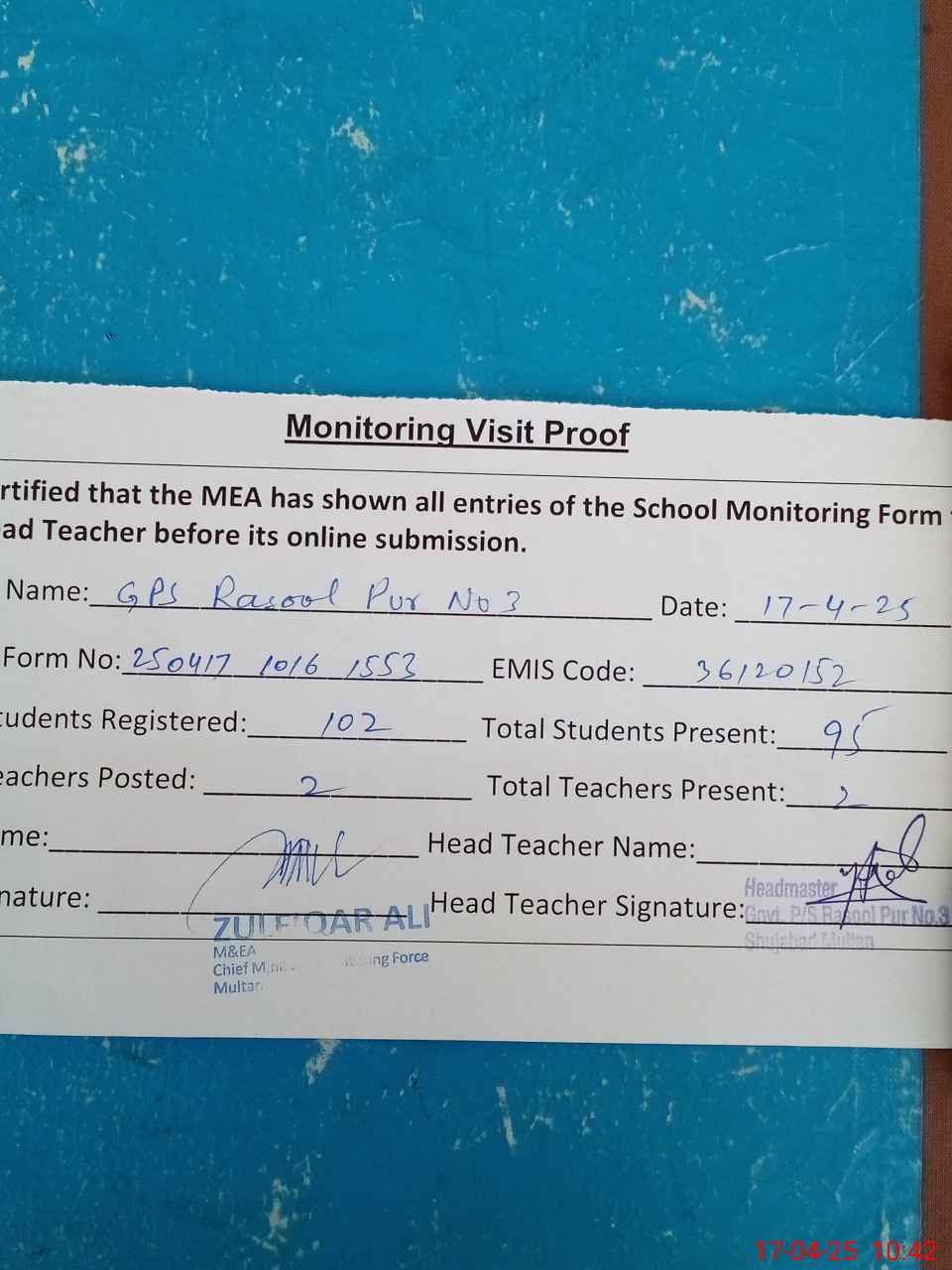 | Attendance Register | Head Teacher | MEA with School | Visit Proof |