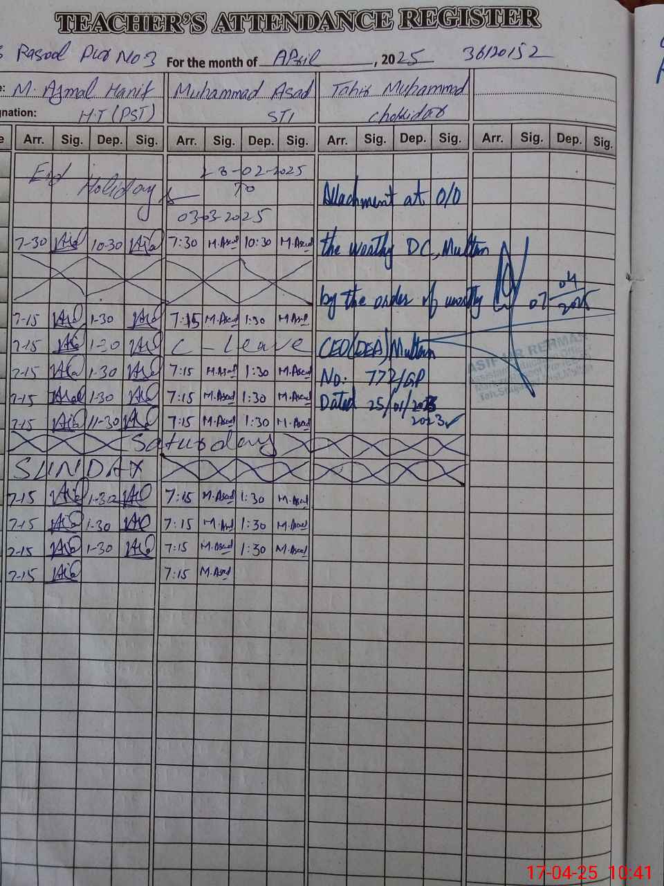 | CNIC | Full Name | Designation | R/C | Absence During Last Calender Month |