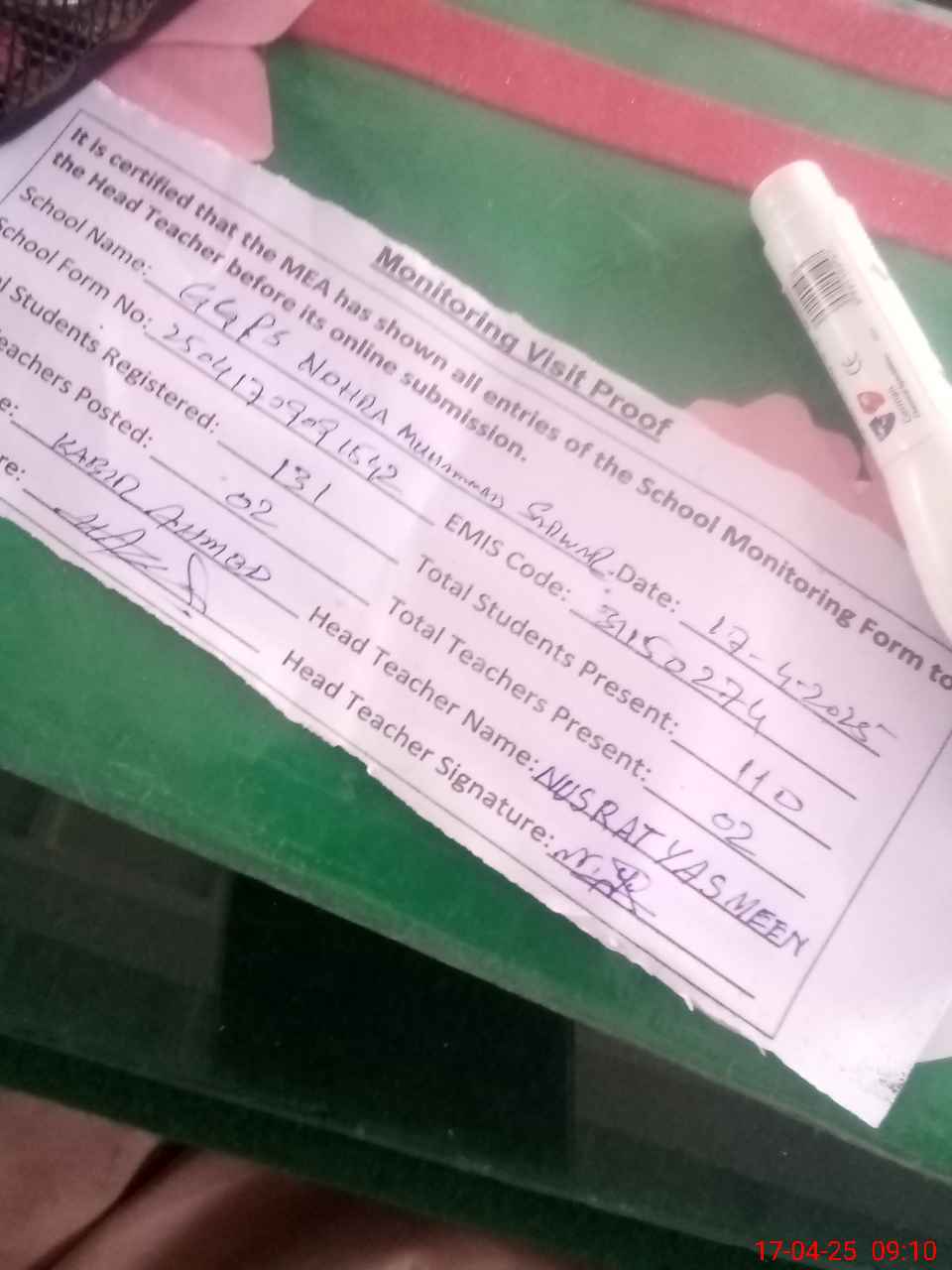 | Attendance Register | Head Teacher | MEA with School | Visit Proof |