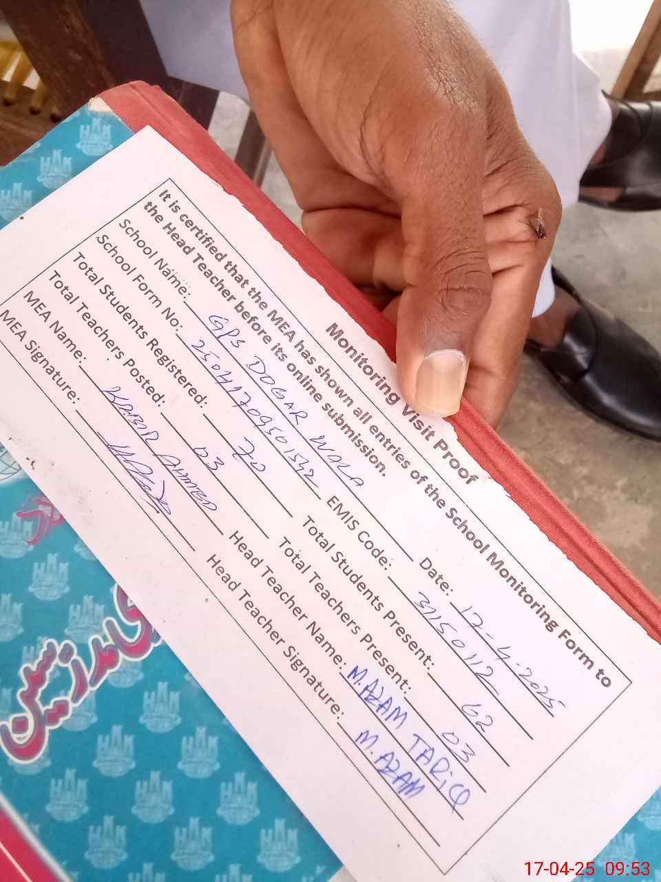 | Attendance Register | Head Teacher | MEA with School | Visit Proof |