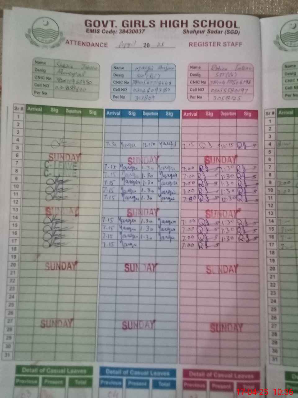 | CNIC | Full Name | Designation | R/C | Absence during last cal. month |