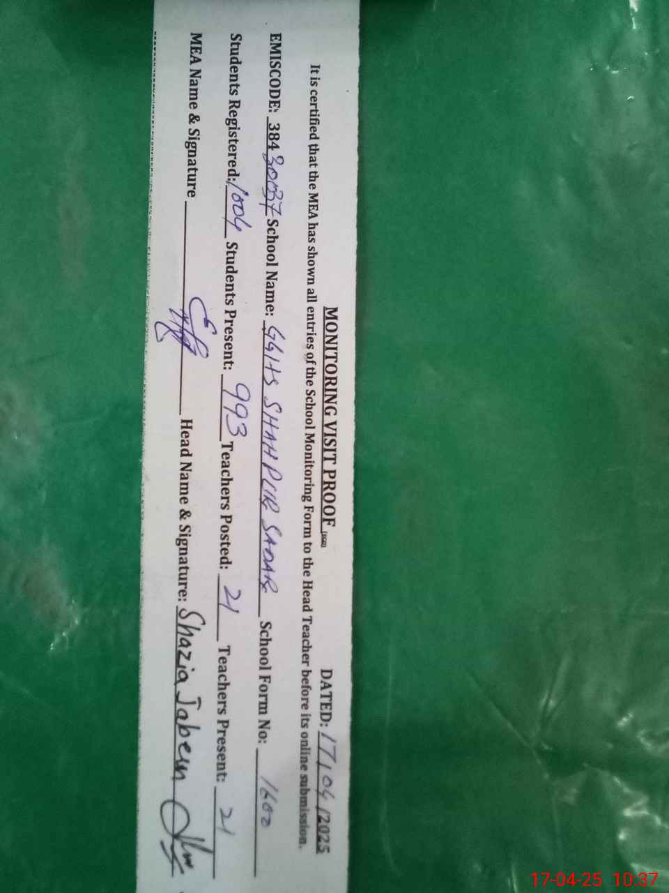 | EMIS Code: 38430037 | Name of School: GGHS SHAHPUR SADAR | |||