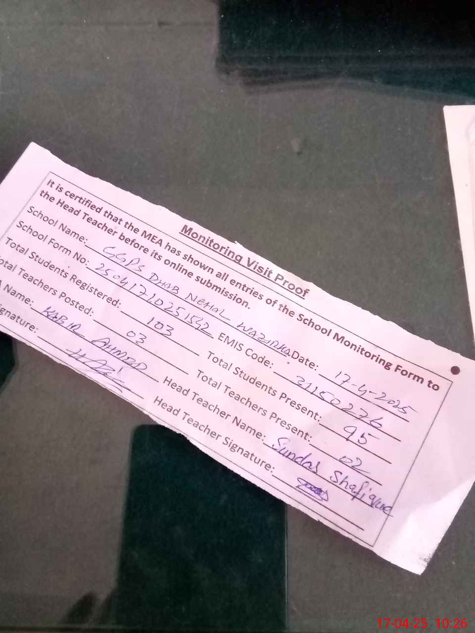 | EMIS Code: 31150276 | Name of School: GGPS DHAB NEHAL WAZIRKA | |||