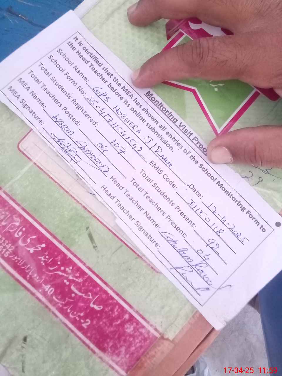 | Attendance Register | Head Teacher | MEA with School | Visit Proof |