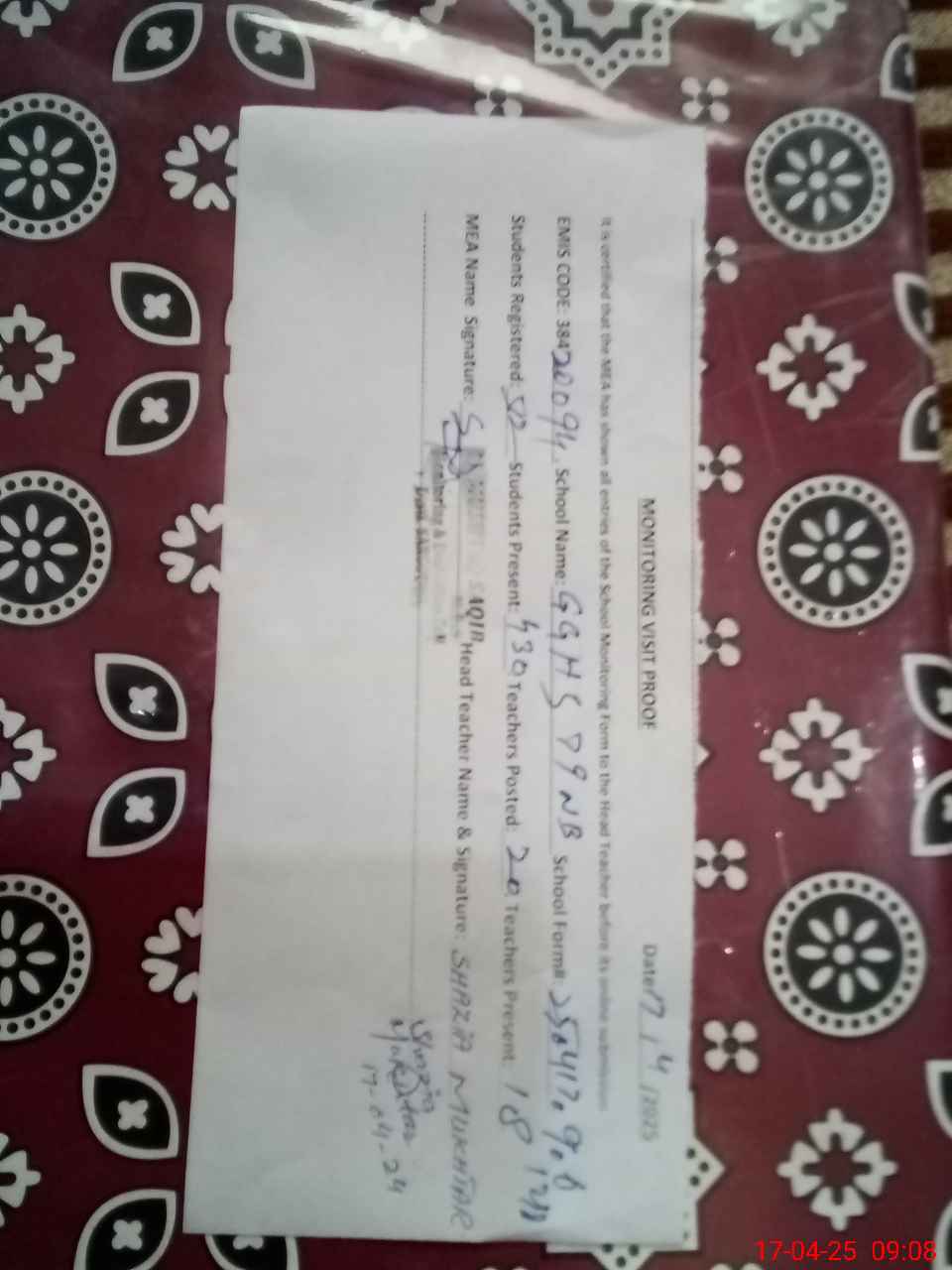 | Attendance Register | Head Teacher | MEA with School | Visit Proof |