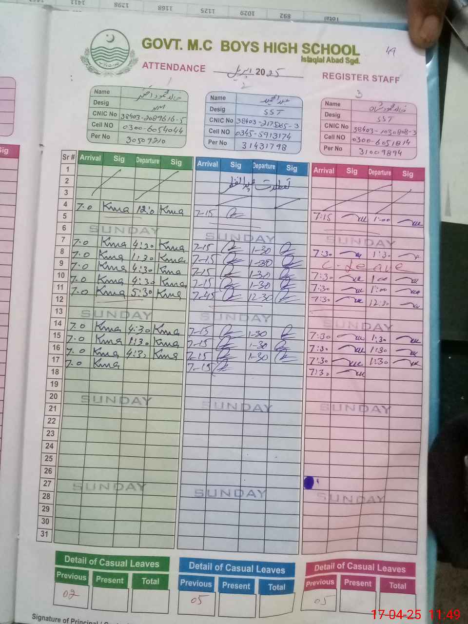 | CNIC | Full Name | Designation | R/C | Absence during last cal. month |